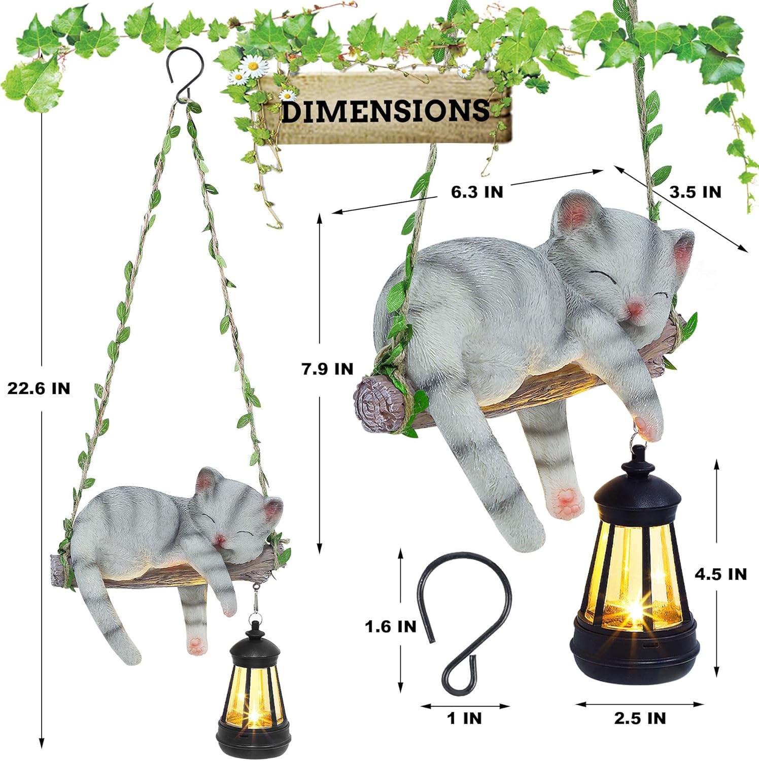 Solar Lighted Garden Outdoor Statue, 22.6" H Hanging Swing Lying with A Sleeping Cat and A LED Lantern, Resin Animal Figurine Hanging Ornaments with Hook for Decoration & Gift