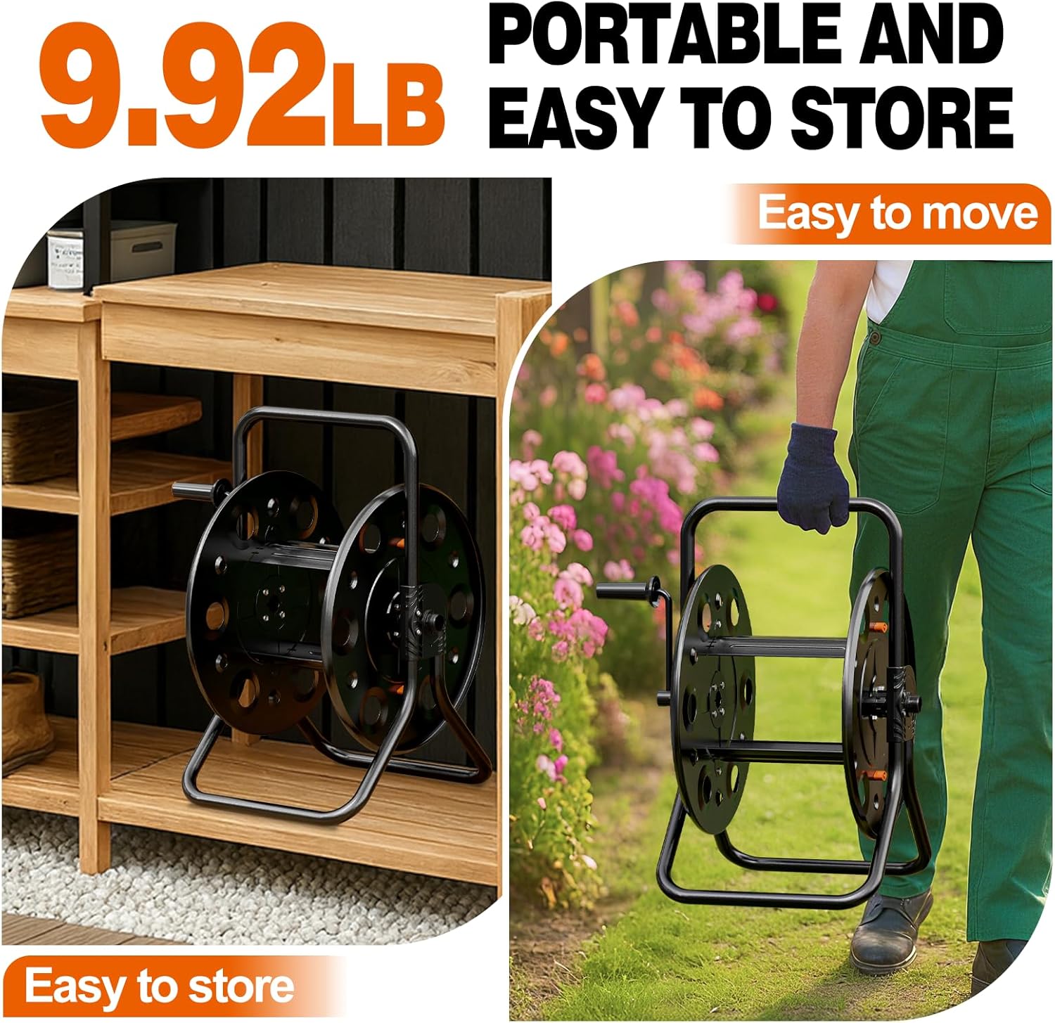 - PORTABLE AND EASY TO STORE: This hose winding reel not only has strong storage capacity but also weighs only 9.92 pounds net. Whether you are moving it between different areas of the yard or storing it in the garage or car trunk, you can carry it easily and set it up for use anytime, anywhere. The water hose storage is your reliable mobile storage assistant