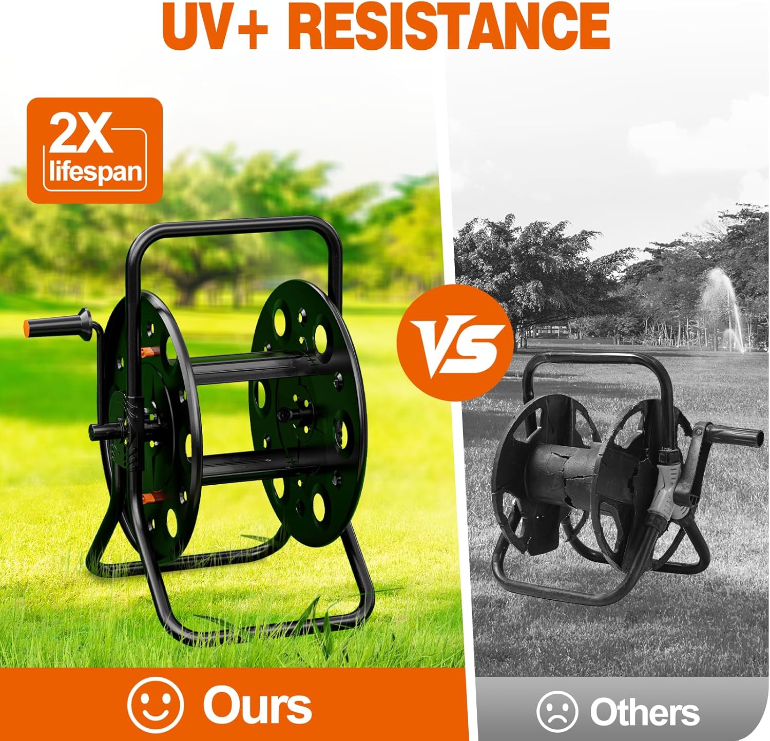 - UV RESISTANCE 2×LIFESPAN: Unlike ordinary metal hose reels on the market, we specifically apply a professional UV-resistant protective coating to the metal surface. This effectively prevents aging, fading, and coating peeling caused by long-term sun exposure, extending the overall service life of the hose spool 2×span. It reduces repeated purchase costs while balancing practicality and economy. Choosing our hose rollers means choosing a long-lasting and worry-free companion