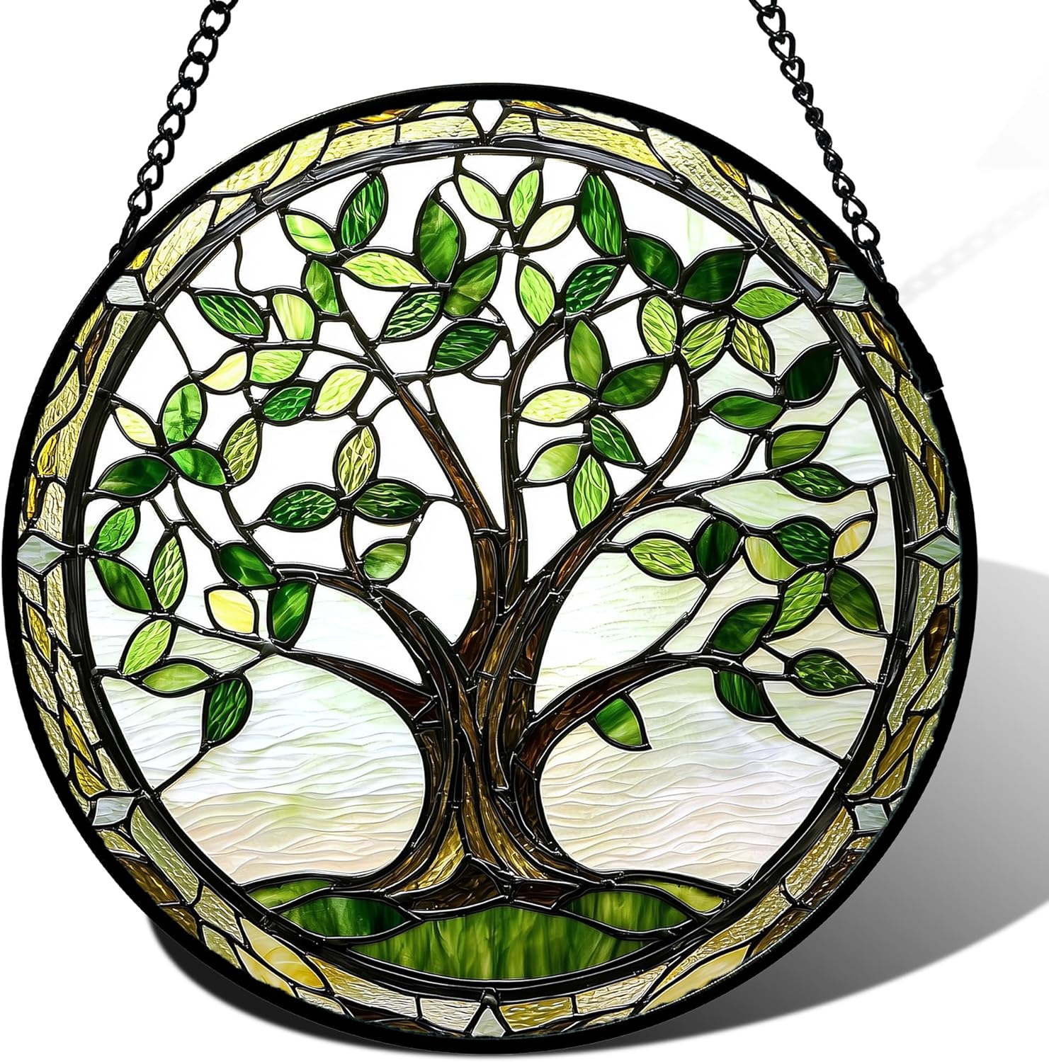 Stained Glass Window Hanging - Brown Tree Trunk Green Leaves Sun Catcher for Door Garden Home Decor Plant Suncatcher Christmas Mother's Day Birthday Gifts for Women Men Mom Nana 6.3 in