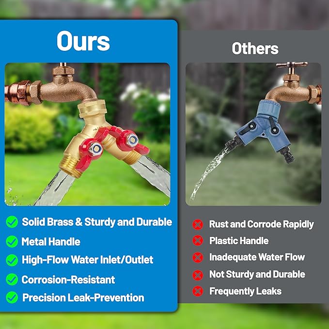 • Durability Upgrade: Made of high-quality solid brass, it ensures rust and corrosion resistance for long-lasting use. This garden hose splitter heavy duty is equipped with metal handle for easy switching, providing easy grip and operation, allowing you to easily control the water flow and turn the valve