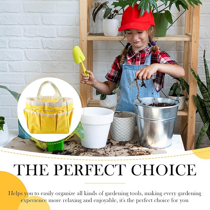 Small Garden Tote Bag Oxford Waterproof with 8 Pockets Gardening Plant Tool Organizer Storage Carrier Store for Outdoor Children (Yellow)