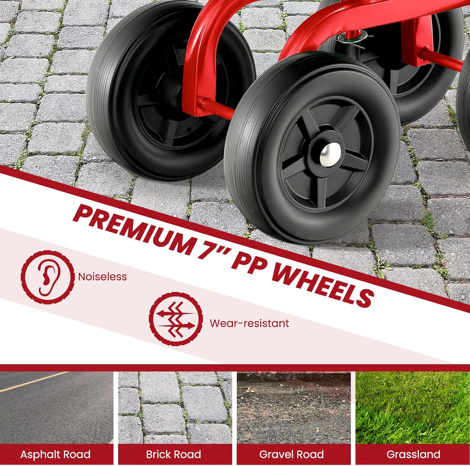 • Smooth 4-Wheel Mobility: Four 7-inch PP wheels of this gardening workseat ensure effortless movement across grass, gravel, and concrete. The anti-skid tires offer stable rolling on varied terrain while seated. This design enhances maneuverability during garden tasks.