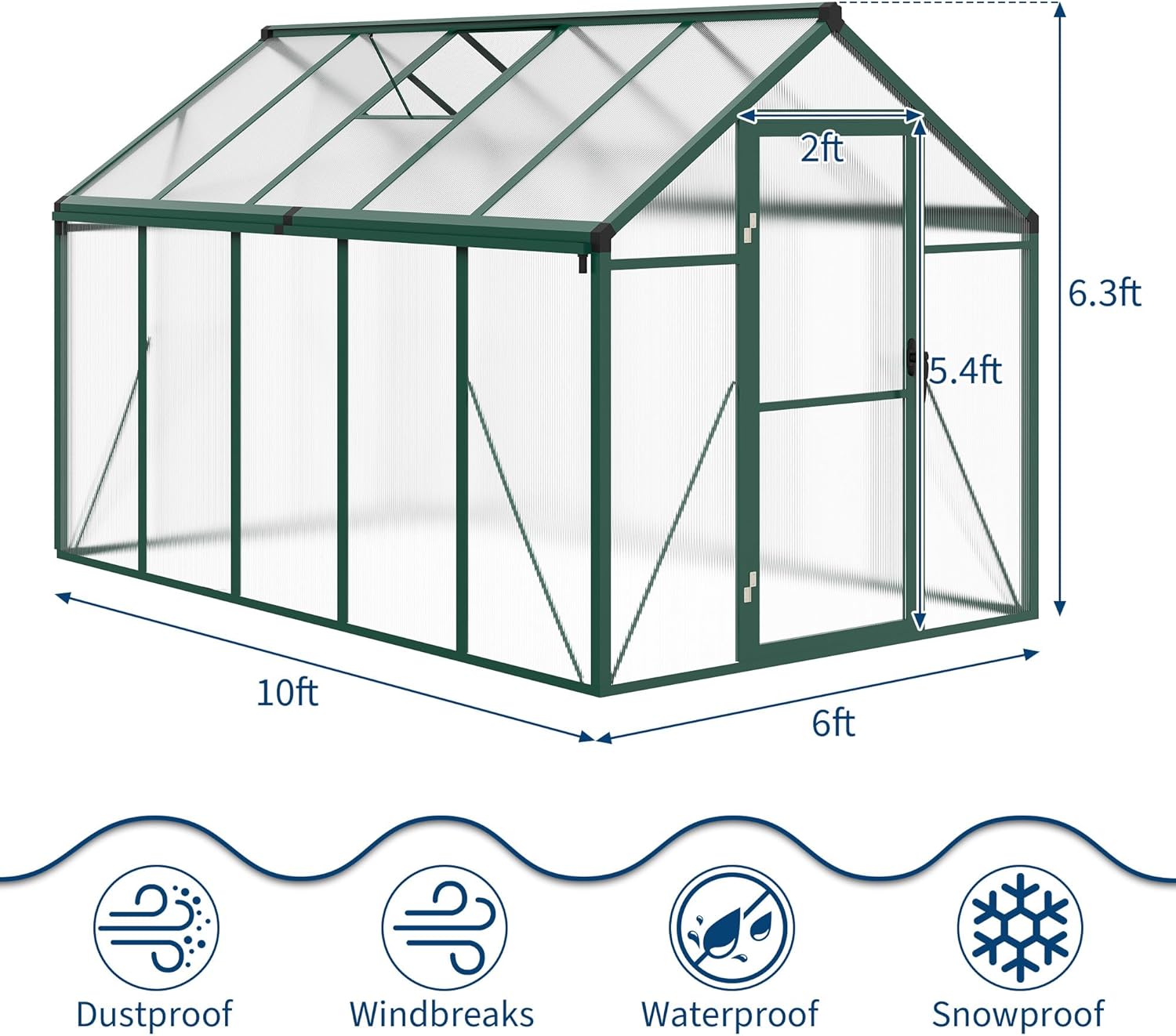 6x10 FT Greenhouse for Outdoors, Polycarbonate Flower Greenhouse with Roof Vent, Push-Pull Lockable Door, Aluminum Walk-in Greenhouses for Outside Garden Backyard, Patio, Lawn, Green