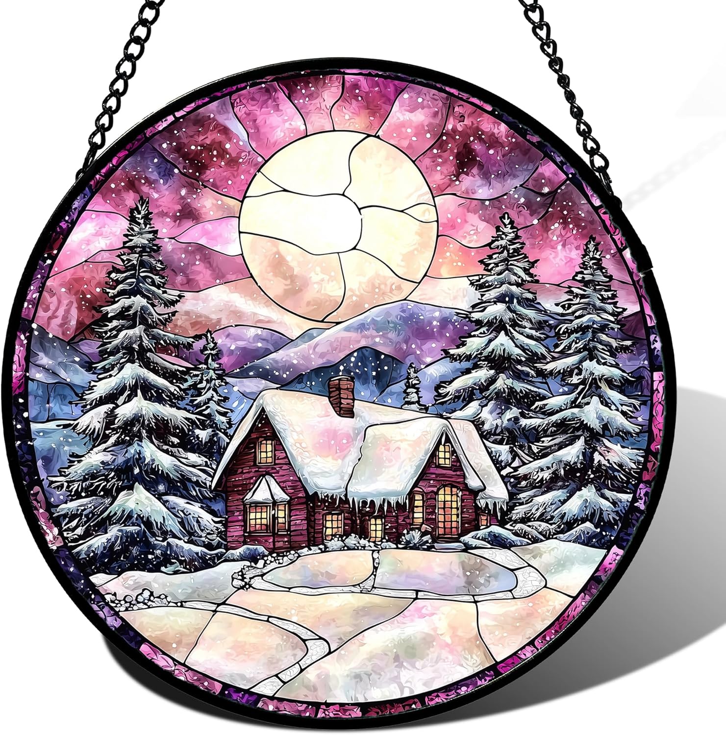 Stained Glass Window Hanging - Winter Snow Scene Cabin Moon Sun Catcher for Door Garden Home Decor Pine Tree Suncatcher Christmas Mother's Day Birthday Gifts for Women Men Mom Nana 9.8 in