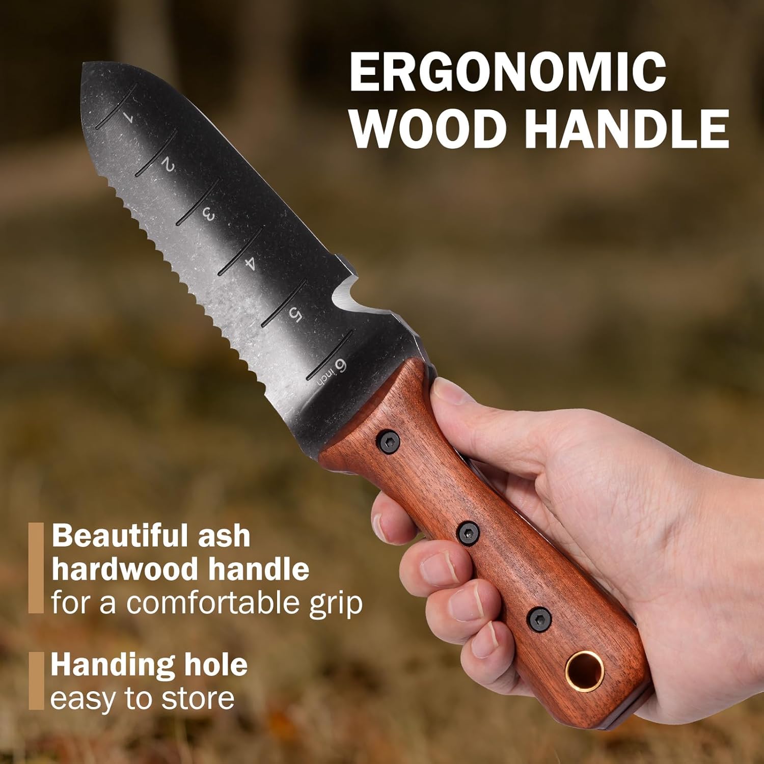 • Wonderfully Versatile: Hori Hori garden knife for every job in the garden, weed puller tool ,use it for digging, transplanting, sawing, cutting, removing, dividing, and even measuring soil depth for planting.