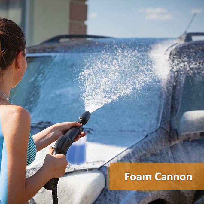 • Customizable Cleaning Solutions: Switch up your cleaning routine with 4 quick-connect nozzles, perfect for everything from blasting stubborn dirt to gently cleaning delicate surfaces. The foam cannon adds a pro-level touch to your car wash routine.