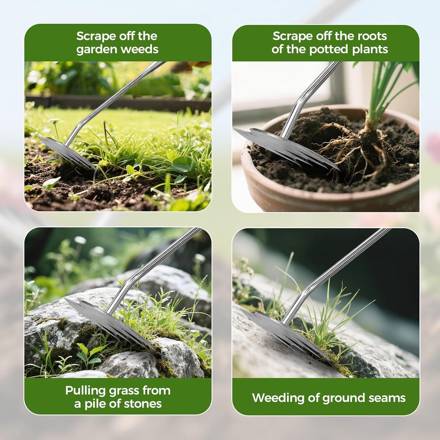 • 【2025 New Upgraded Weeding Tool】With a unique 4-tooth structure design, it can complete root prying, soil loosening and weeding with a single operation. Effortlessly tackles deep-rooted weeds like thistles and stubborn plants such as dandelions. The upgraded extendable handle allows use in both standing and squatting positions, making gardening efficient and effortless.