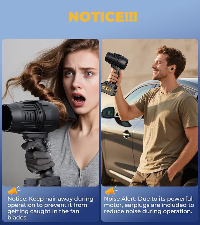 - 【Powerful airflow & Adjustable Speed】This battery powered leaf blower equipped with high-speed motor that delivers up to 300,000 RPM and 50m/s wind speed for 600G wind pressure.Stepless speed control allows you adjust airflow intensity based on pressure—press lightly for gentle dusting or firmly for turbocharged power to tackle leaves,snow,or stubborn debris.Perfect for patio cleaning,lawn care,and car drying.Note:Due to its powerful airflow,earplugs are included to reduce noise during operation