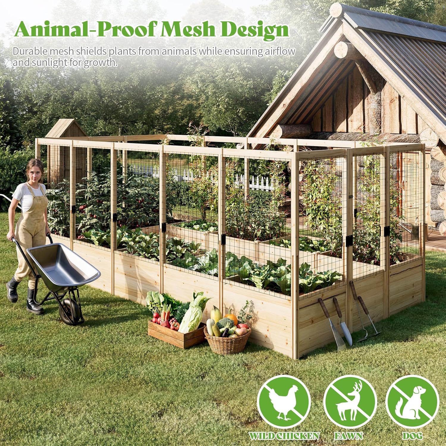 PaPaJet Wooden Raised Garden Bed for Outdoor, Eleven Grid Deep Large Planter Box with Netting for Gardening, Vegetables, Flowers, Herbs(7.5× 14.8× 5.9FT)