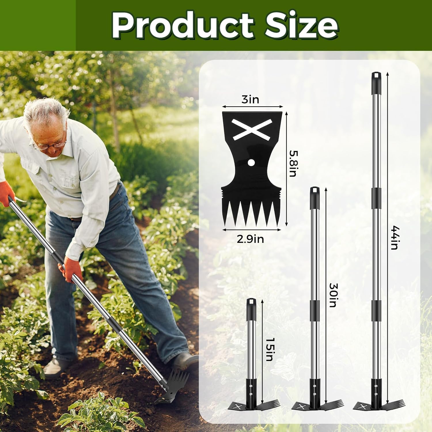 • Safety & Maintenance Guidance: Always inspect the tool's structure and clear work areas of rocks/roots before use. Store with the head grounded when not in use. Includes 3 stainless steel poles and a weed rake head, and a pair of gloves.