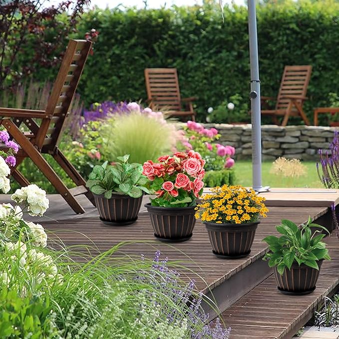 FGstyle 4 Pack Flower Pots,8 Inch Plants Pot,Planters Pot with Drainage Hole & Saucer,Modern Planters for Indoor Outdoor Plants,Decorative Resin Garden Pots for Outdoor Indoor Home Plants (Black)