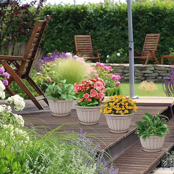 FGstyle 4 Pack Flower Pots,8 Inch Plants Pot,Planters Pot with Drainage Hole & Saucer,Modern Planters for Indoor Outdoor Plants,Decorative Resin Garden Pots for Outdoor Indoor Home Plants (Beige)