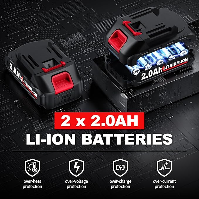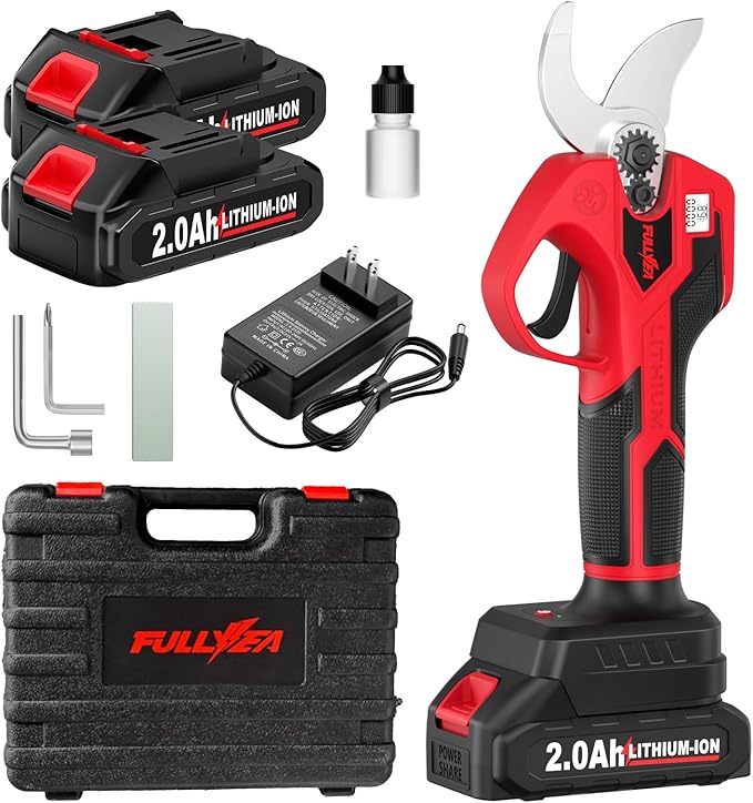 • [ Portable Accessory Set ] -- Cordless pruner kit includes : 1 x Electric branch cutter, 2 x 2.0Ah Batteries, 1 x Fast Charger, 1 x Wrench Set, 1 x Sharpening Stone, 1 x User Manual, 1 x Portable Tool Box.