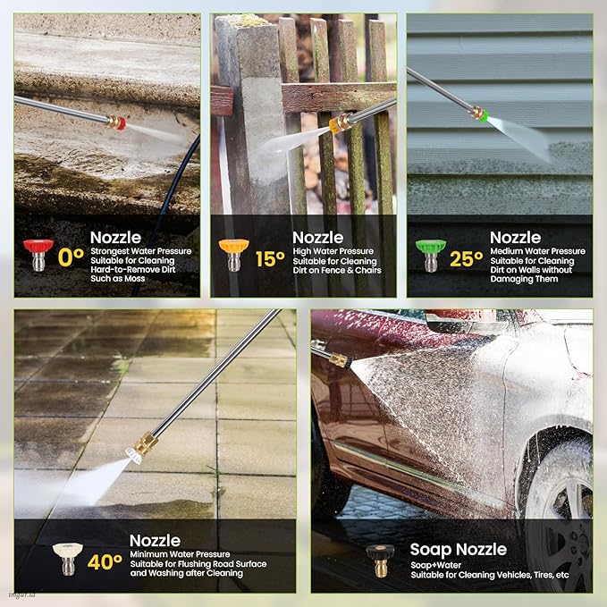 - ใ๐ ๐๐๐ฉ๐ฅ๐๐๐๐๐๐ฅ๐ ๐๐จ๐ณ๐ณ๐ฅ๐๐ฌใ: This gas power washer is equipped with 4 universal nozzles with different angles: 0ยฐ, 15ยฐ, 25ยฐ, 40ยฐ and soap nozzle. You can install nozzles with different angles according to different cleaning needs. The larger the angle, the greater the water flow and the lower the pressure; the smaller the angle, the smaller the water flow and the greater the pressure.