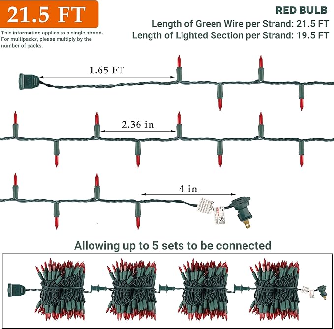 • Green Wire Christmas Lights: Our 100-count red incandescent mini lights will brighten up your home this Christmas. Each bulb is spaced 2.36 inches apart. A built-in 3A fuse ensures safe operation, and extra bulbs and fuses are included for replacements. These high-quality UL-certified lights prioritize the safety of your family