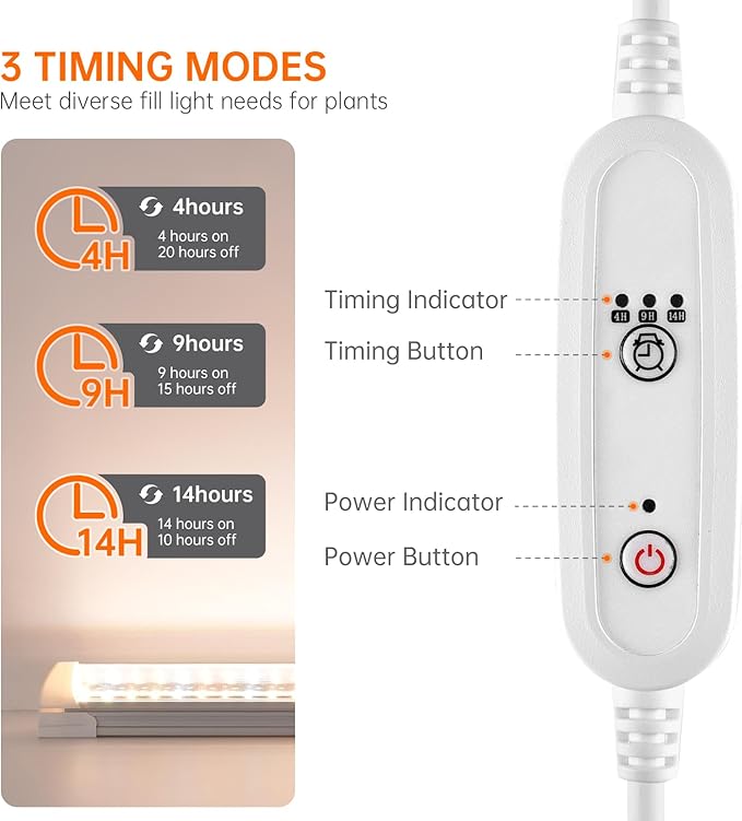 - Convenient Timer Function - The grow light strip features a timer function that allows you to easily set the indoor plant light to automatically turn on and off at your preferred intervals (4, 9, or 14 hours). This ensures your plants receive ideal lighting even when you are on vacation or busy with work, providing daily automated care