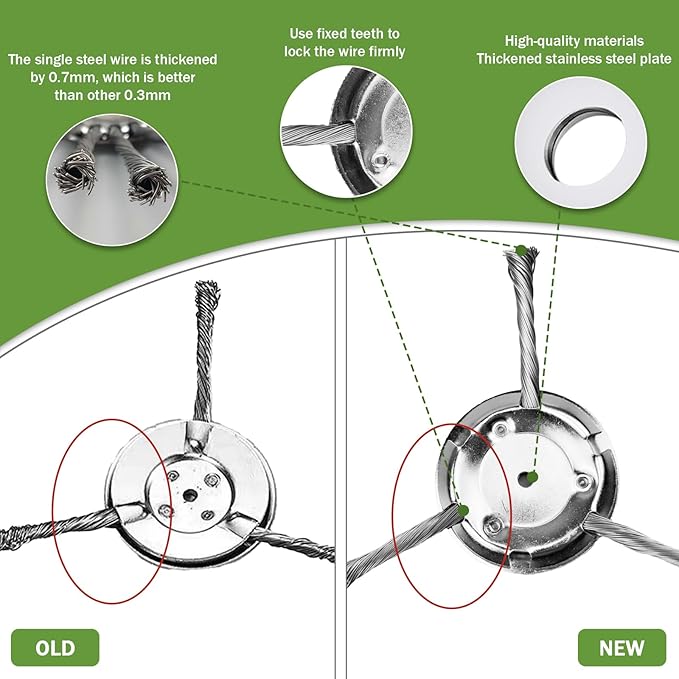 • Safeguarding Safety: The innovative wire fixed tooth design can firmly lock the wire to prevent the wire from flying around and shifting during use. This indestructible trimmer head also uses a balanced layout of wires, one by one, sharp and wear-resistant, with a tight fixed tooth structure, and is not easy to fall off.