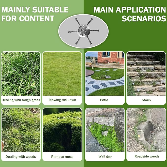 • Multi-scenario Application: This wire weed trimmer head creates full-specification products to meet diverse operational needs and easily cope with various complex terrains. Whether it is the roadside, stone cracks, brick cracks, steps or wall cracks, it can easily remove weeds, moss, dirt and rust, truly achieving one machine for multiple uses and solving various problems.