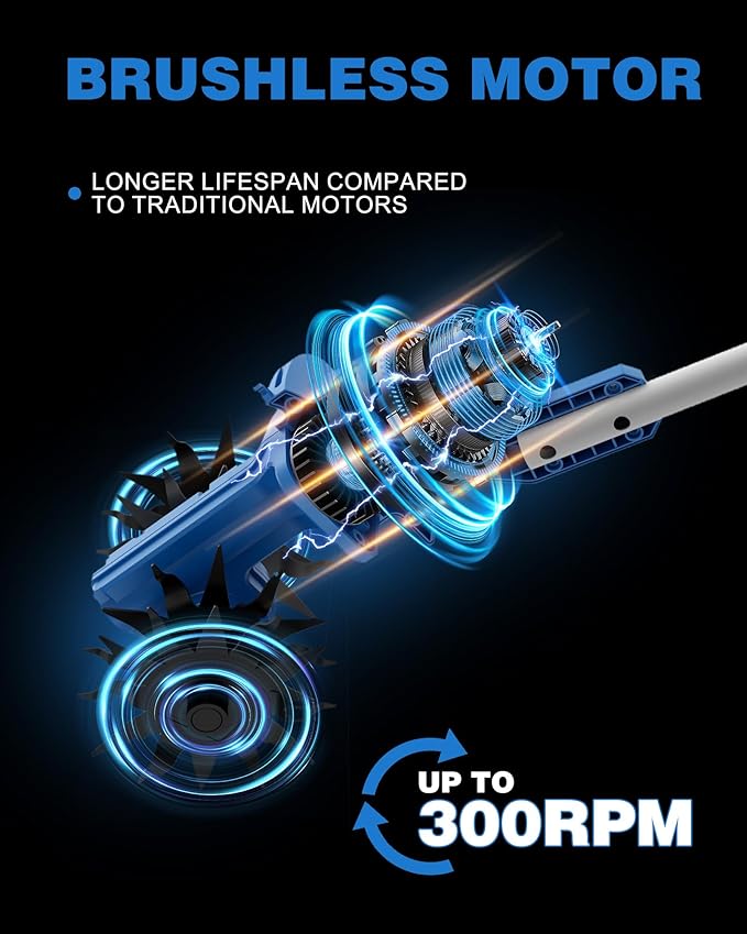 • 【Brushless Motor】:Equipped with an advanced brushless motor reaching speeds up to 300RPM, this garden tiller delivers strong and stable power for every gardening task. The brushless design reduces friction and energy loss, lowering noise levels and minimizing maintenance needs. Whether loosening soil, turning earth, or tackling tough terrain, it handles all with ease Ideal for both home gardeners and professionals seeking reliable performance