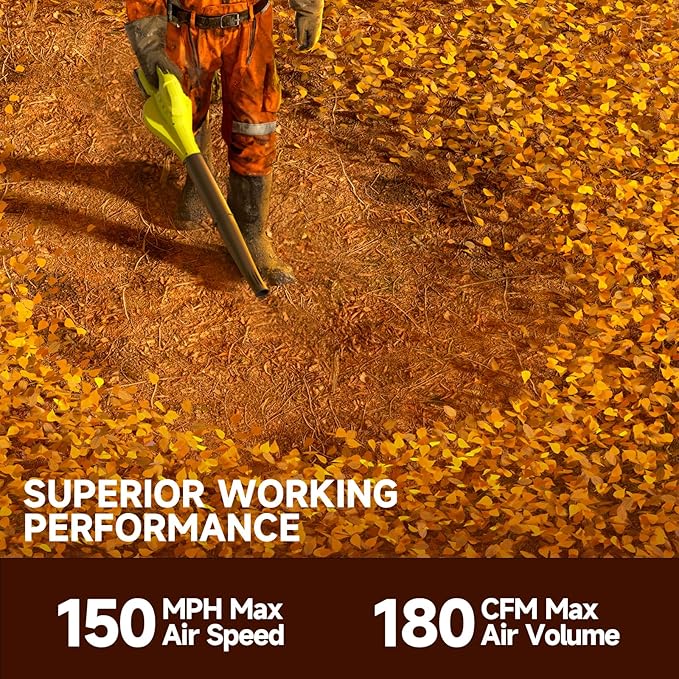 • 3 VARIABLE SPEEDS: This battery leaf blower features an adjustable speed button for versatile use. Level 1 (90 MPH) clears dust and debris, Level 2 (120 MPH) sweeps leaves and grass, and Level 3 (150 MPH) handles fluffy snow and heavy leaves. Includes an extension tube for precise, hard-to-reach areas cleaning.