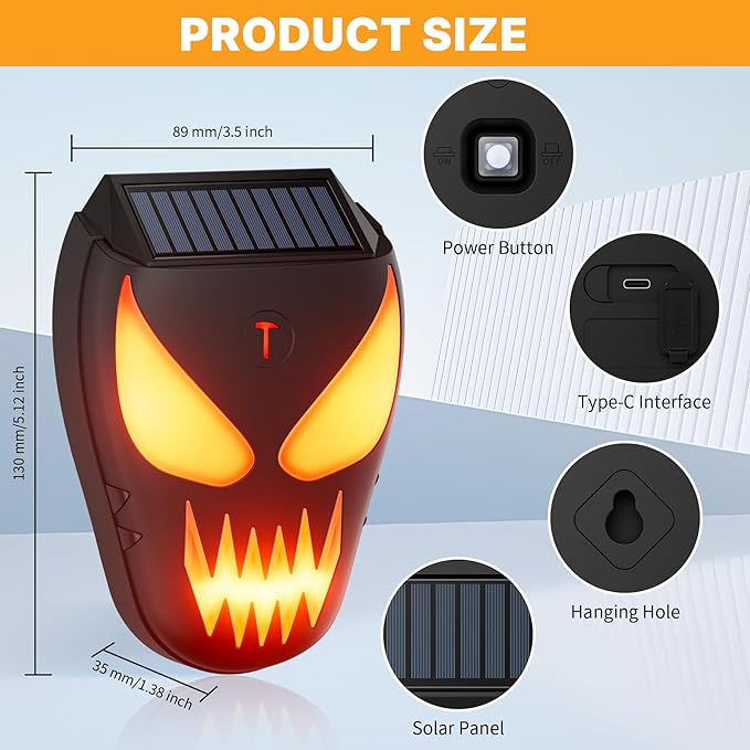 • 【Great Value & Practical】Equipped with 13 amber LED lights (3 solid, 10 flashing), this raccoon repeller is not only suitable for a variety of outdoor areas such as gardens, patios, chicken coops, farms and livestock farms, but also looks unique and suitable for Halloween decorations. If you have any questions please contact us.