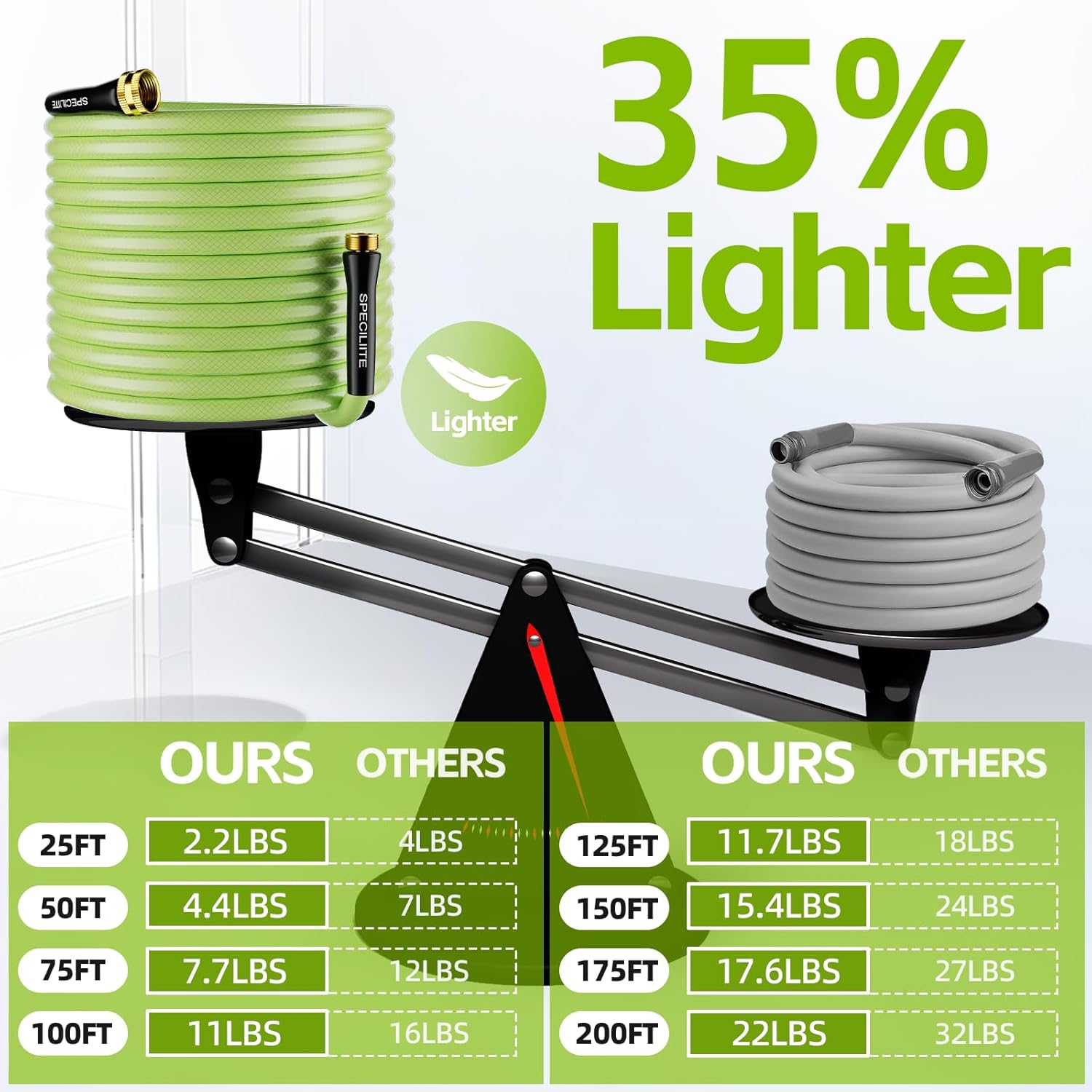 • LIGHTWEIGHT 35% : Innovatively combining heavy-duty construction with a 35% lighter design (weighing only 17.6LBS), this hose maintains industrial-grade durability while enhancing maneuverability. Its user-centric design adapts to all ages and physical conditions, ensuring accessible comfort for every watering task.