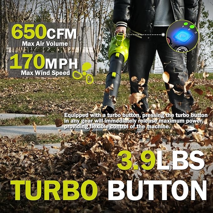 - 【Advanced Axial Fan Technology and High Performance Brushless Motors】: The Sihuird Leaf Blower uses a High Efficiency Brushless Motor, Maximum setting 32000 rpm, Adopting advanced axial fan technology, it provides greater air volume and more heat dissipation than traditional centrifugal fans. And equipped with 12 turbine blades and turbocharging function, providing higher airflow. Air volume and wind speed up to 650CFM and 170MPH.
