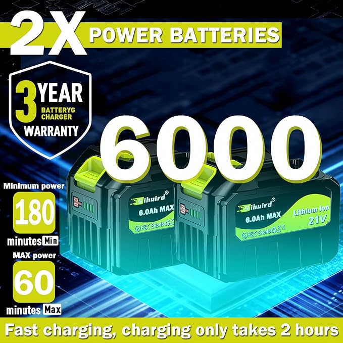 - 【Upgrade to 2x6.0Ah Batteries】:Sihuird Cordless Leaf Blower Equipped with 2x6.0Ah batteries and a fast charger, In daily life, the average usage time of 2x6000mAh batteries can reach 180 minutes, and even at maximum wind speed, they can last for 60 minutes, solving the problem of time anxiety.