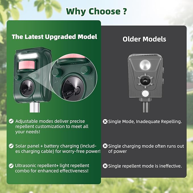 • 【Multiple Charging Methods】Features a built-in high-efficiency solar panel requiring no wiring or batteries. The device automatically charges in sunlight, providing an eco-friendly and economical solution for round-the-clock animal control. An additional charging cable is included for emergency charging during prolonged periods of cloudy or rainy weather.