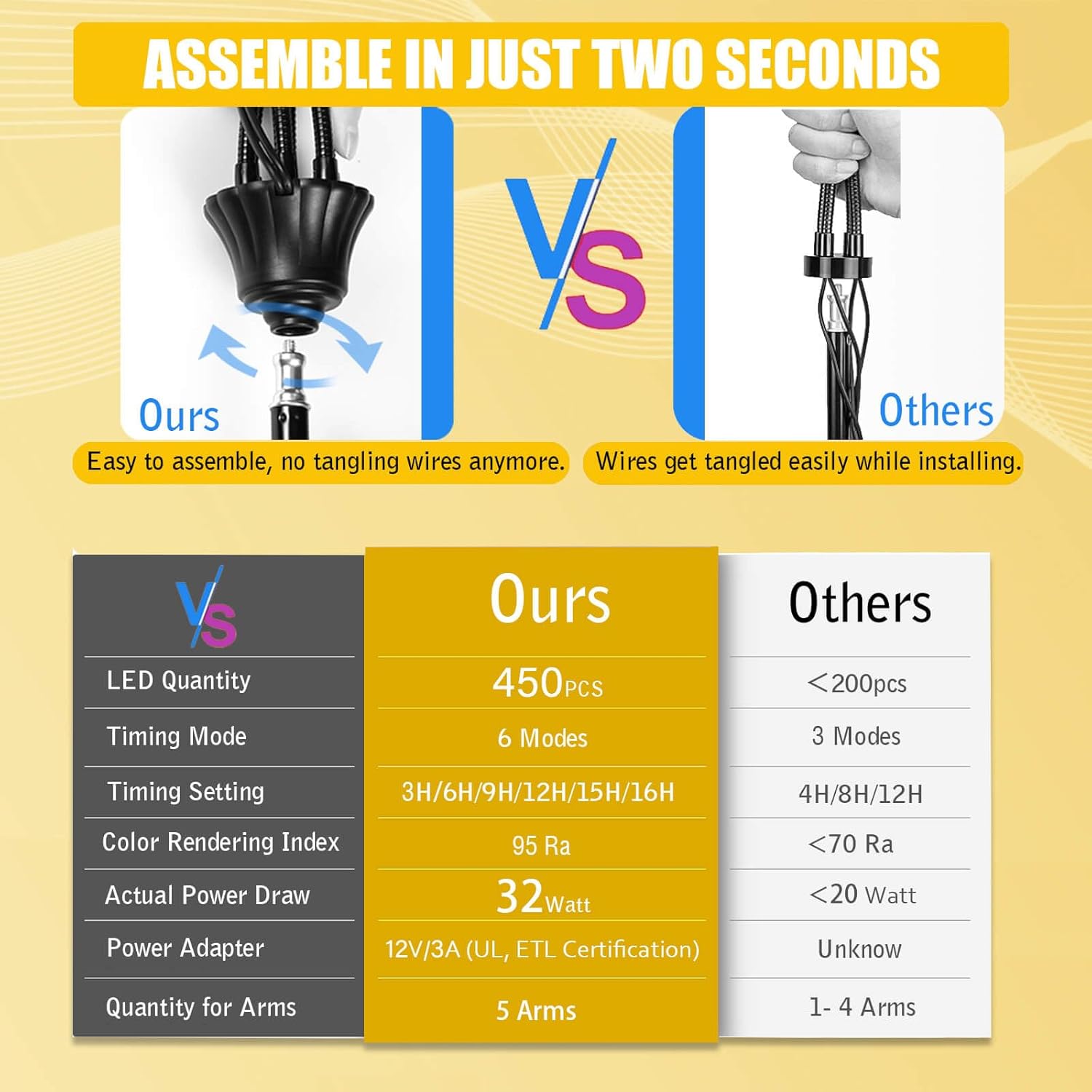 • ☀【5 IN 1 -450 LEDS -WIDER COVERAGE 】The full spectrum grow lights for indoor plants have 5 round light heads up to 1.8 inches diameter (90% of similar products have a diameter of 1/2 inch), each of which can be individually adjusted for direction and brightness. with a total of up to 450 leds having a stronger and wider coverage than similar products. It perfectly addresses the shortcomings of insufficient coverage and inadequate brightness found in similar products.