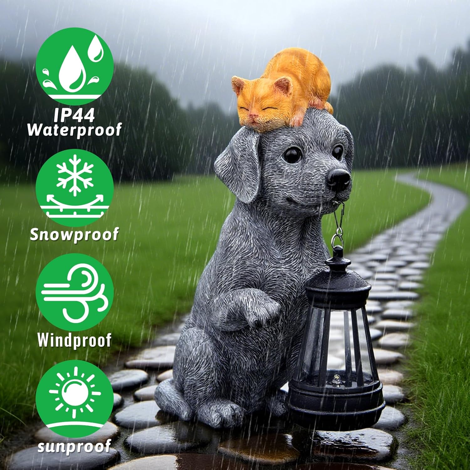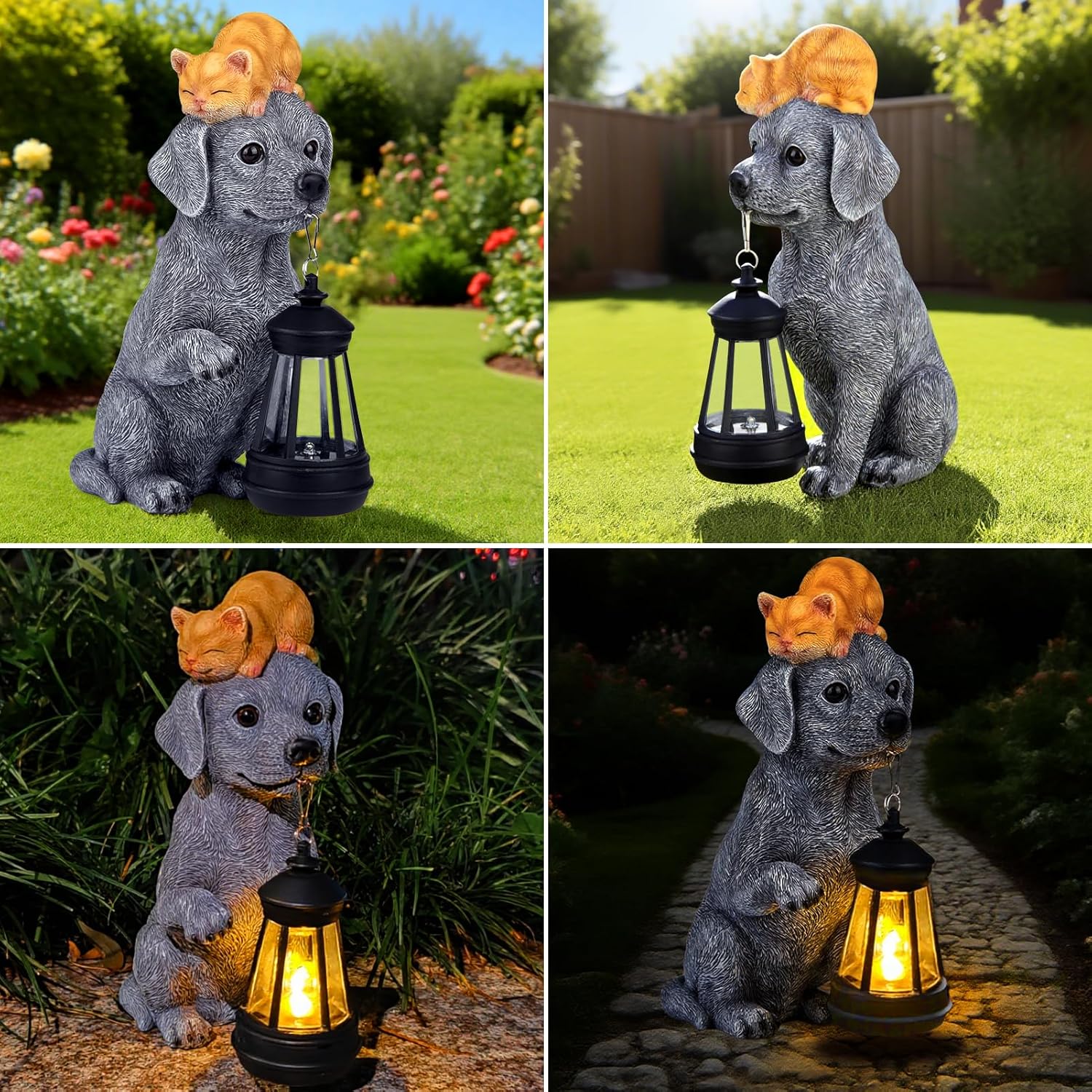 • 【Adorable Dog & Cat Design】 This heartwarming statue features a loyal gray dog holding a lantern with a peacefully sleeping orange kitten on its head, adding charm and cuteness to your outdoor space