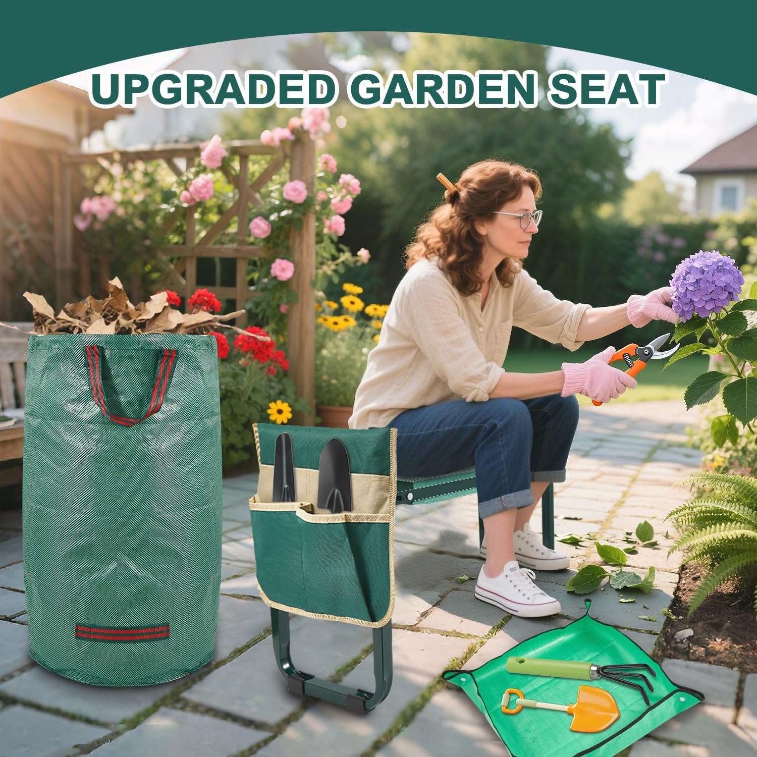 • COMPLETE GARDENING KIT: Includes reusable 32-gallon leaf bag (tear-resistant) + 19" repotting mat. Eliminates separate purchases—perfect for gardening stool tasks from potting to debris cleanup. Includes removable tool pouch for quick access.