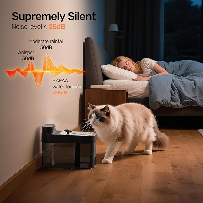 - [Innovative Separation System, No Filter Cotton Needed] - Our cat water fountain features an advanced clean and wastewater separation design, with a 101oz (3L) clean water tank and a separate 46oz (1.35L) wastewater tank. This prevents contaminated water from recirculating, ensuring your pet always drinks fresh, clean water. Best of all, the HAPAW cat water dispenser operates without filter cotton, so you never have to buy or replace expensive filter cotton again.