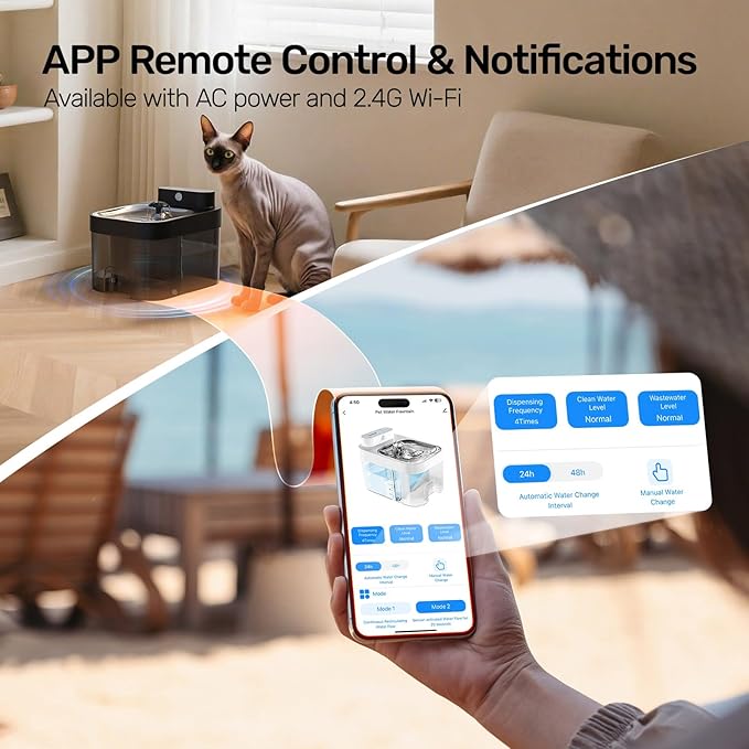 - [App Monitoring & Notifications] - This smart cat fountain lets you monitor both water levels remotely through the app. You can customize drainage schedules, trigger manual water refresh, and set up personalized scenarios. Receive instant notifications so you’re always informed about your pet’s water supply—anytime, anywhere. Note: App functions require the fountain to be plugged in and are not available in battery mode.