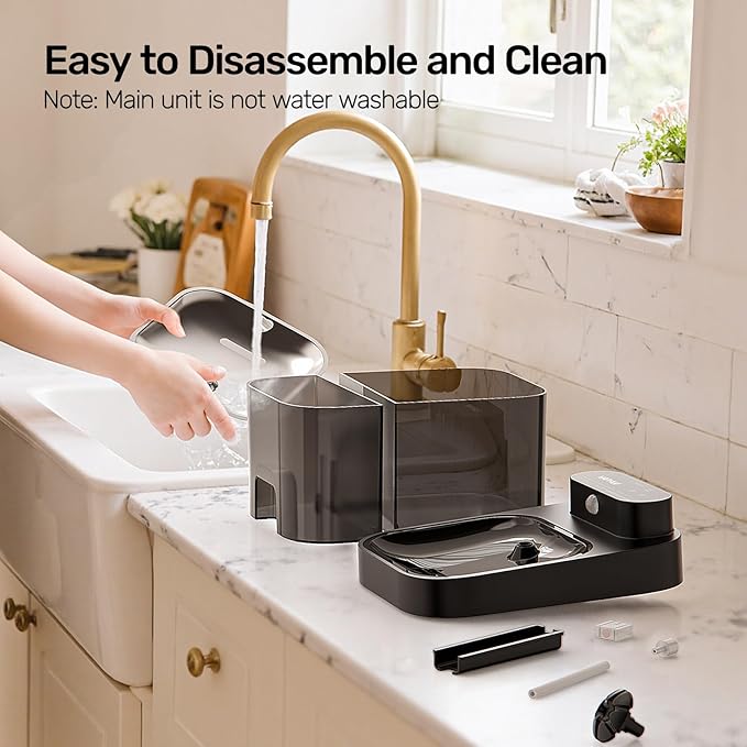 - [Dual Water Modes & Easy Cleaning] - Choose between smart-sensing mode (water flows when your cat approaches) or continuous flow mode. The stainless steel cat water fountain is hygienic and easy to clean: simply rinse the detachable tanks, bowl, and tray, and wipe the main unit with a soft cloth. Note: The main unit is not washable.