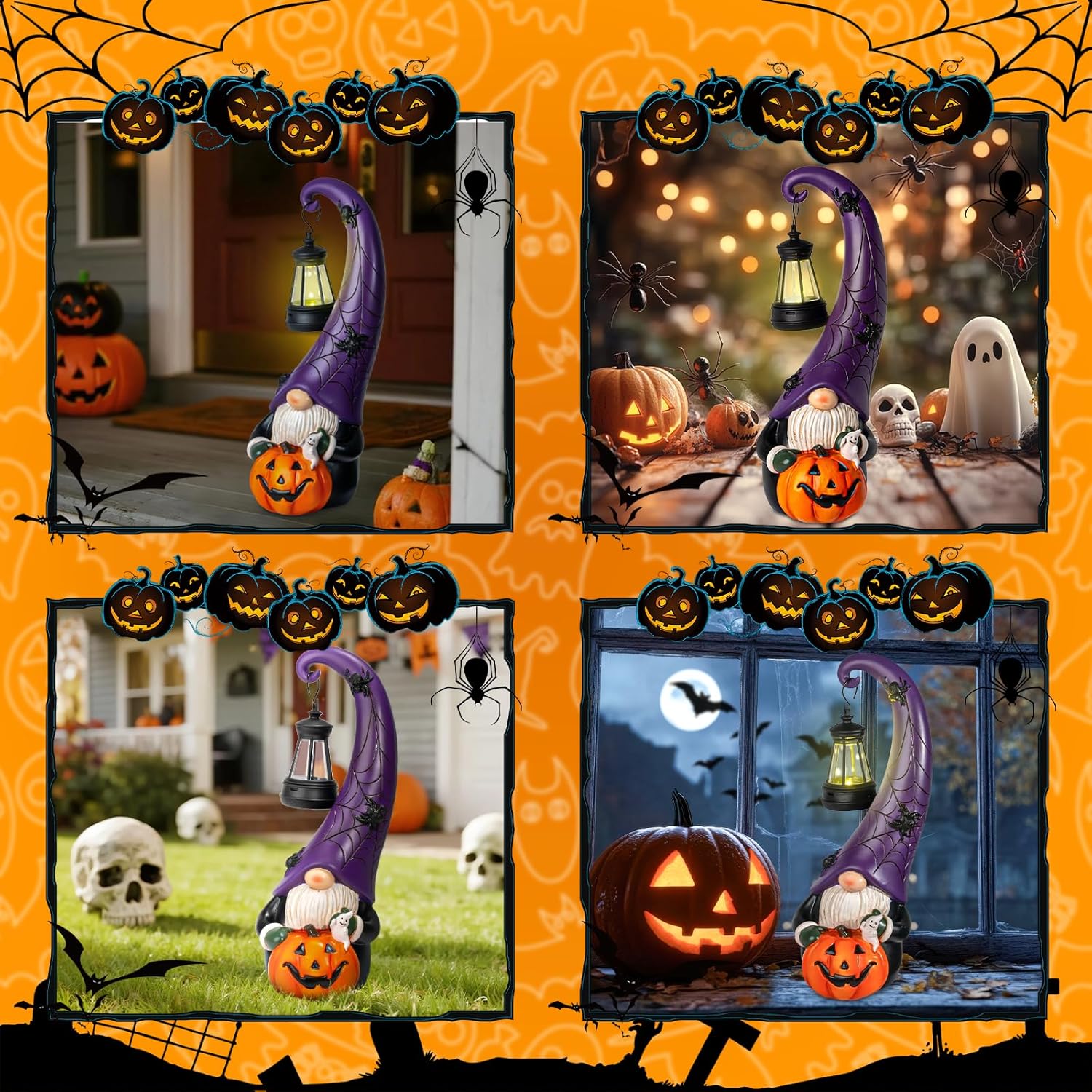 • 【Halloween Gnome Outdoor Decor】 Adorable Halloween gnome statue with a tall purple witch hat, spider web details, white beard, and pumpkin in hand. A playful yet spooky piece for your porch, yard, garden, or patio Halloween decorations.