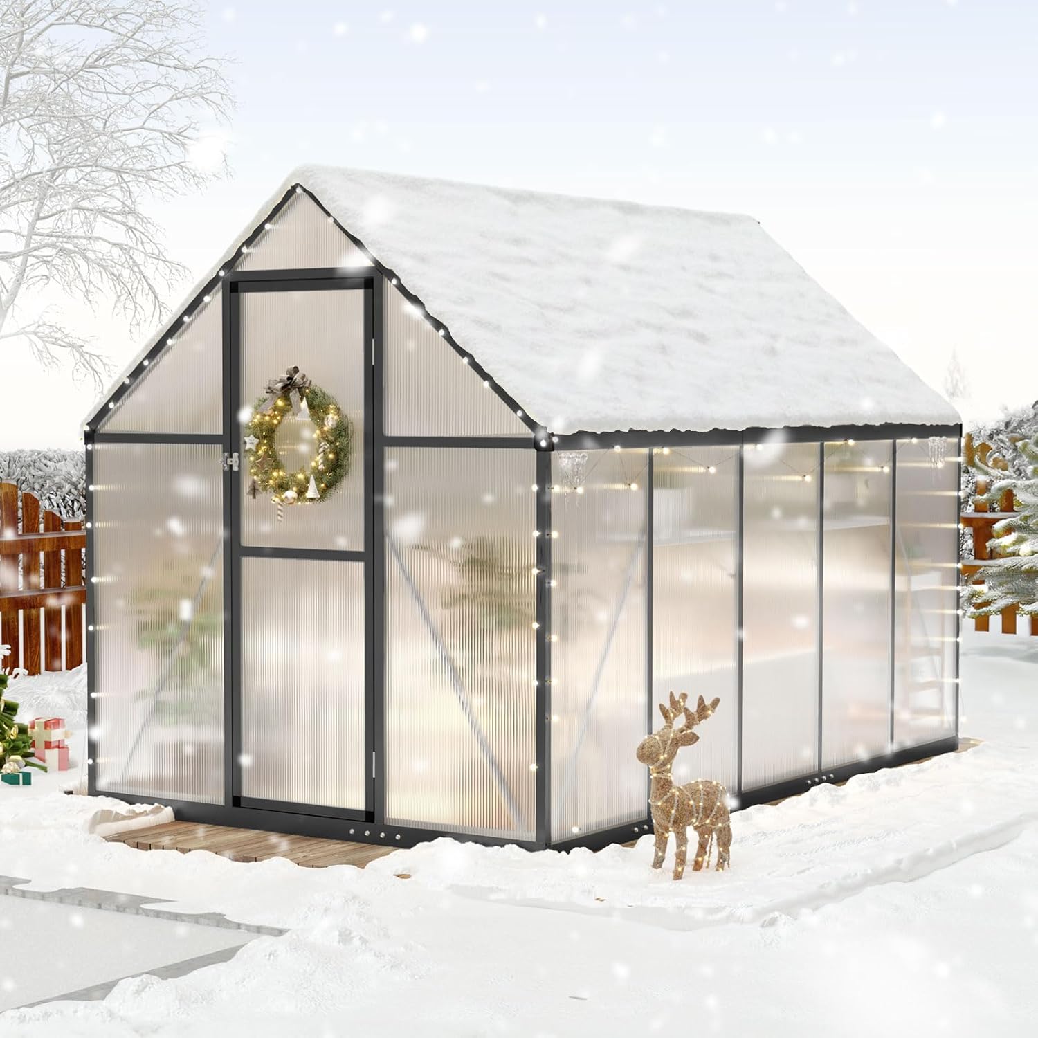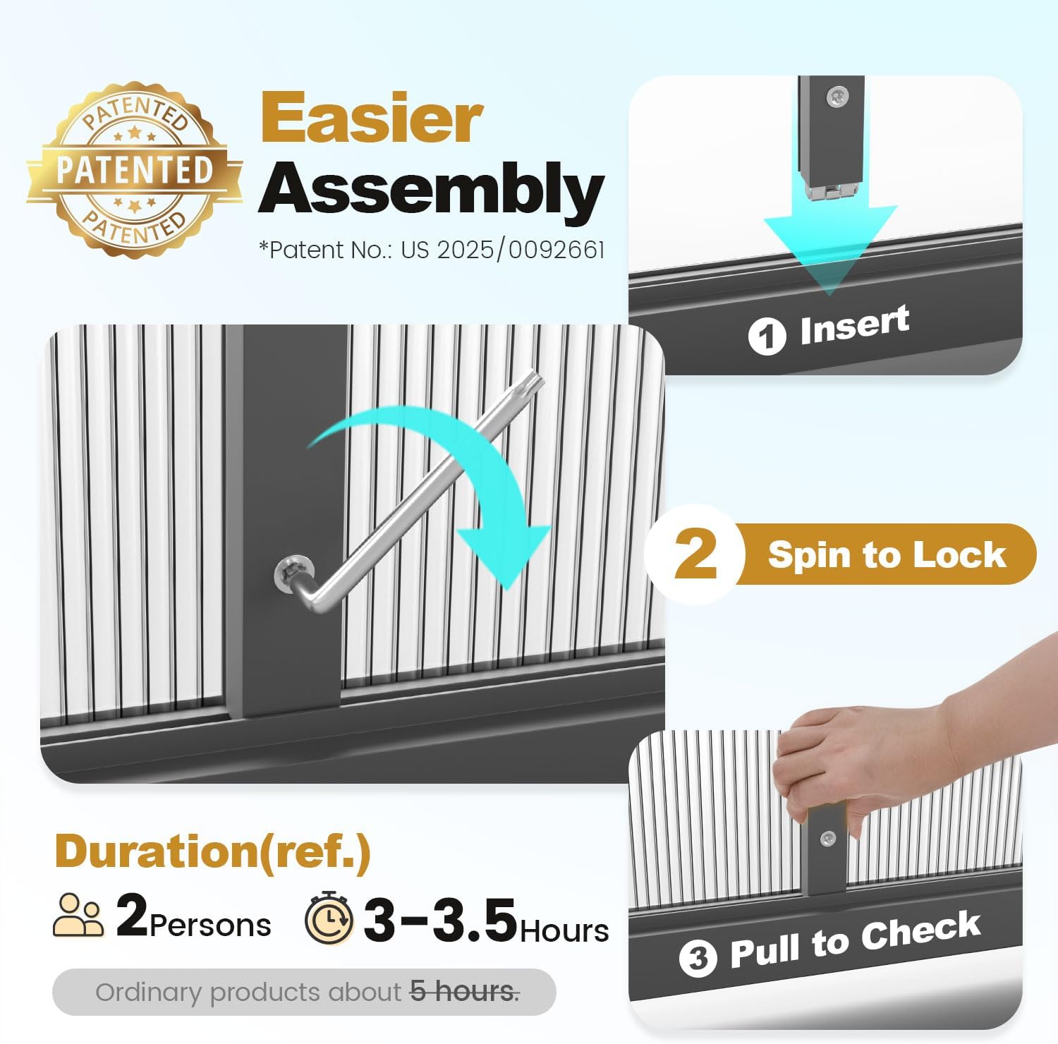 • Quick-Connect Frame: This KING BIRD polycarbonate(PC) greenhouse is built with aluminum sturdy frame. The patented(US 2025/0092661) Quick-connect system simplifies the process which reduces 60% installation time, allowing 2-3 people to easy assemble in 2-5 hours (varied with sizes) under our concise and clear instructions/video compared to other unauthorized items.