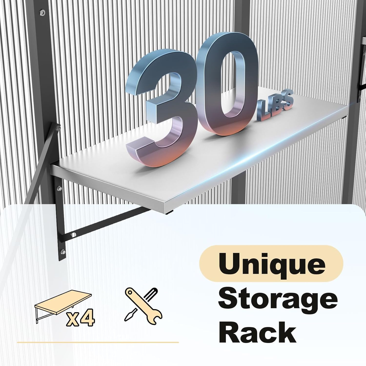 • Unique Storage Racks: The product comes with 2 storage racks. The integrated design ensures good aesthetics. Each rack can bear 30 lbs of weight. You can easily place other common tools such as kettles, shovels, etc. on the shelf for easy access, or you can place small flower pots, decorations, etc. to decorate your greenhouse.