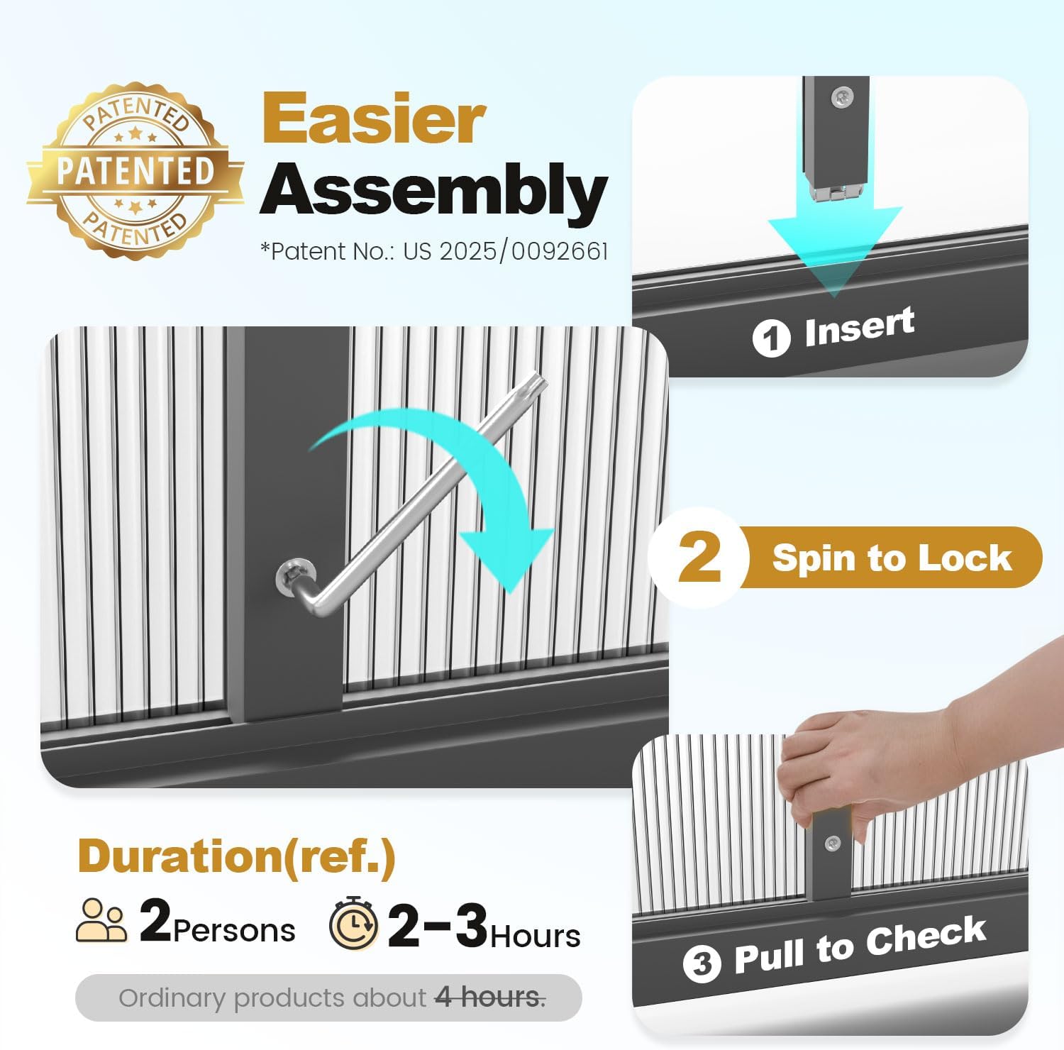 • Quick-Connect Frame: This KING BIRD polycarbonate(PC) greenhouse is built with aluminum sturdy frame. The patented(US 2025/0092661) Quick-connect system simplifies the process which reduces 60% installation time, allowing 2-3 people to easy assemble in 2-5 hours (varied with sizes) under our concise and clear instructions/video compared to other unauthorized items.
