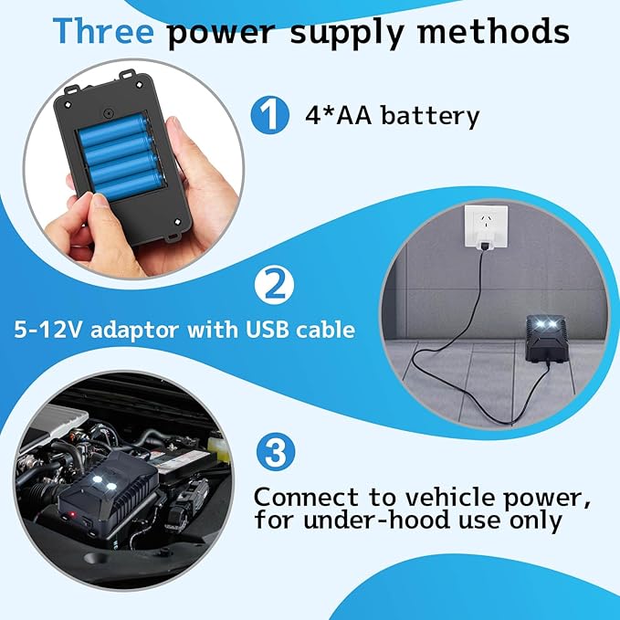 • Three power supply modes: Three charging modes are provided for easy use. 1: Use 4 AA batteries, 2: Use a USB cable to connect to a 5-12V adapter for charging, 3: Use a DC cable to connect to the power supply under the hood of the car