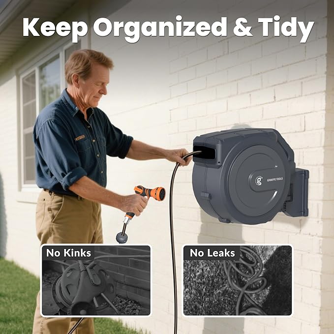 Giraffe Tools AW30 Retractable Garden Hose Reel 5/8inch x 62ft Hose Reels for Outside, with 9- Function Sprayer Nozzle, Any Length Lock/Slow Return System/Wall Mounted/180°Swivel Bracket