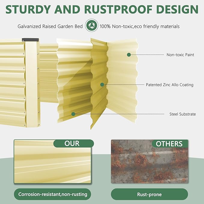 • 【Safety & Eco-Friendliness】The corners of the garden bed are rounded to prevent injury from sharp edges, ensuring user safety. The coating material is non-toxic and environmentally friendly, preventing the leaching of harmful substances into the soil and maintaining a clean and healthy growing environment for plants and vegetables.