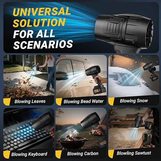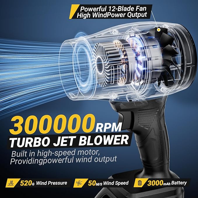 • 【High Power Performance】The turbo jet blower has a maximum speed of 300000 RPM, a wind speed of up to 50 M/S, a blowing power of 520 G,The hand held leaf blower is an excellent tool for cleaning up fallen leaves in the yard, dust in the workshop, or road debris.