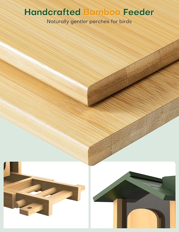 • Bamboo Build & IP66 Weatherproof: Less Plastic, More Life!: This camera bird feeder will seamlessly blend into your garden like a growing plant – not plastic junk. IP66 approved - rain proof, snow-resistant, and heat-tolerant. Whether it's sunny or stormy, your bird feeder camera keeps working, ensuring a reliable birdwatching experience 365 days