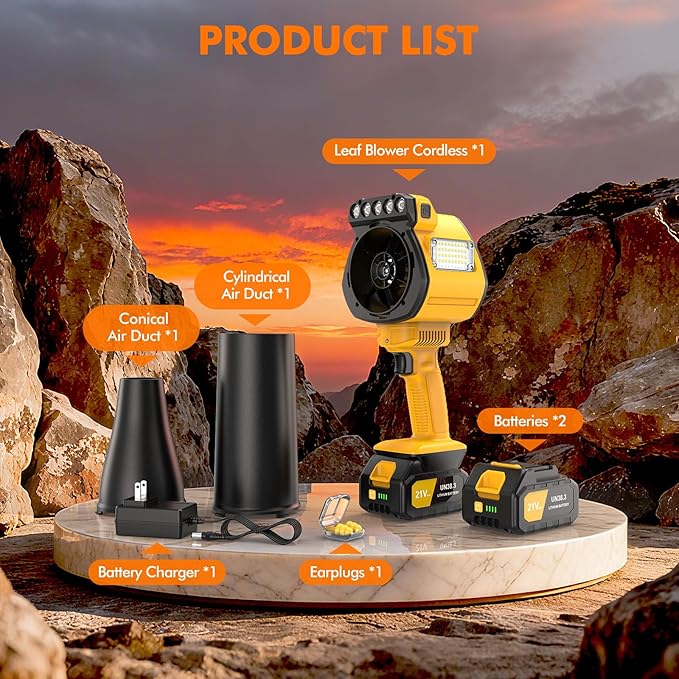 - Included Components : leaf blower *1, batteries *2, charger *1, cylindrical air duct *1, conical air duct *1, earplugs*1, manual*1 leaf blower *1, batteries *2, charger *1, cylindrical air duct *1, conical air duct *1, earplugs*1, manual*1