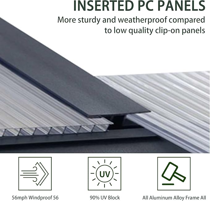 • STRONG AND SUITABLE: Our outdoor green house is built of reinforced poles, a sturdy aluminum frame, and hardware that can withstand any abuse. It aids in corrosion prevention. It also has a slanted barn rooftop design, which can significantly improve the product's wind resistance. Greenhouse panels made of UV-resistant polycarbonate provide a good thermal insulation effect and a high impact resistance, allowing you to protect your plants from cold, rain, scorching, and pets.