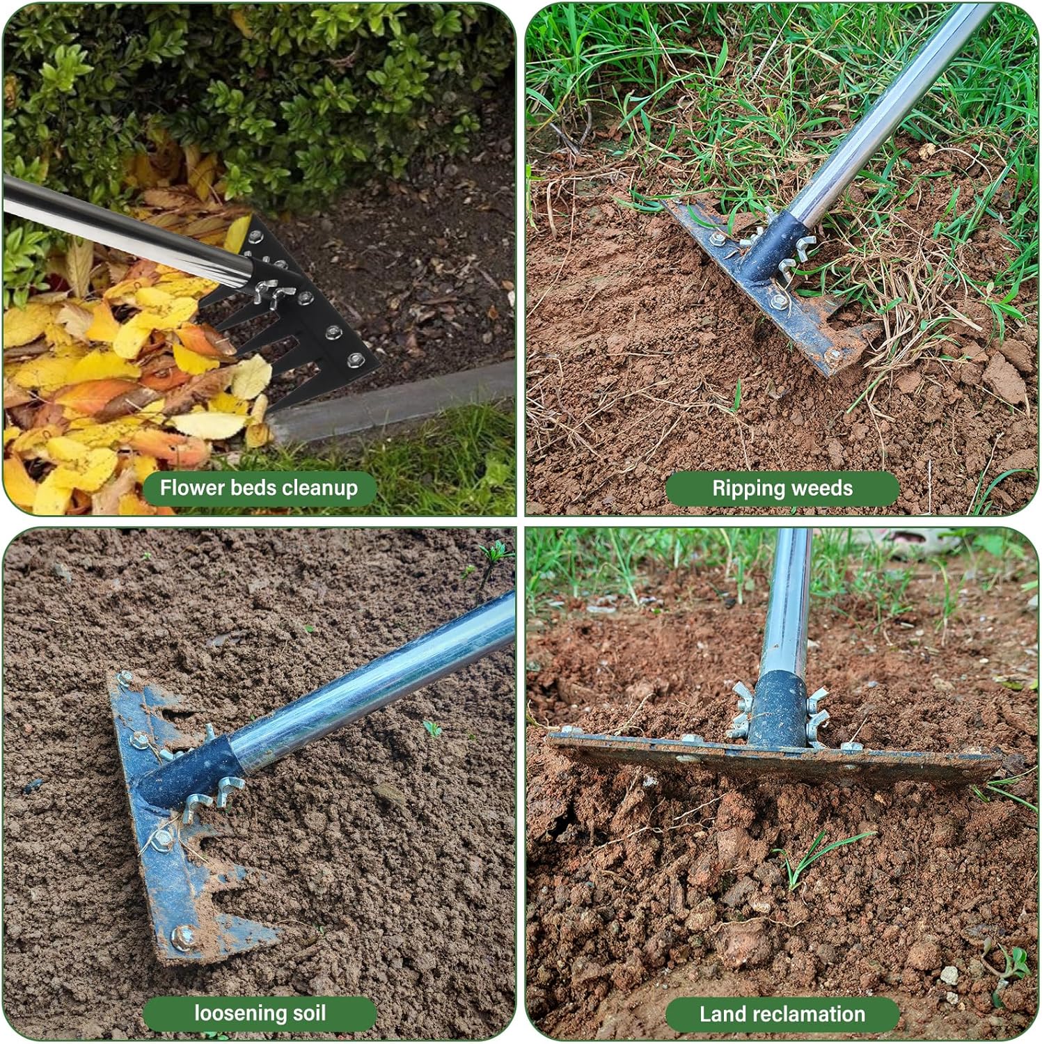 • 【ADJUSTABLE STAINLESS STEEL EXTENSION POLE】The handle length of the weed rake can be adjusted to 33 inches, 47 inches, or 62 inches by adding or removing the extension pole. This design allows users to easily adjust the handle without needing to purchase additional ones, making it more convenient for the elderly and children to use.