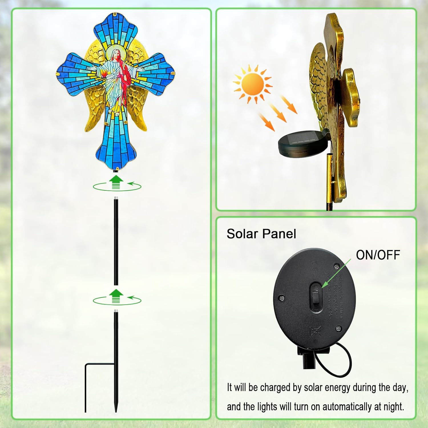 • Elegant solar lights Jesus cross garden stake,designed as a heartfelt cemetery decoration for graves,featuring golden angel wings as a touching sympathy memorial gift.Perfect for outdoor decor,holiday garden,lawn,yard,or patio.