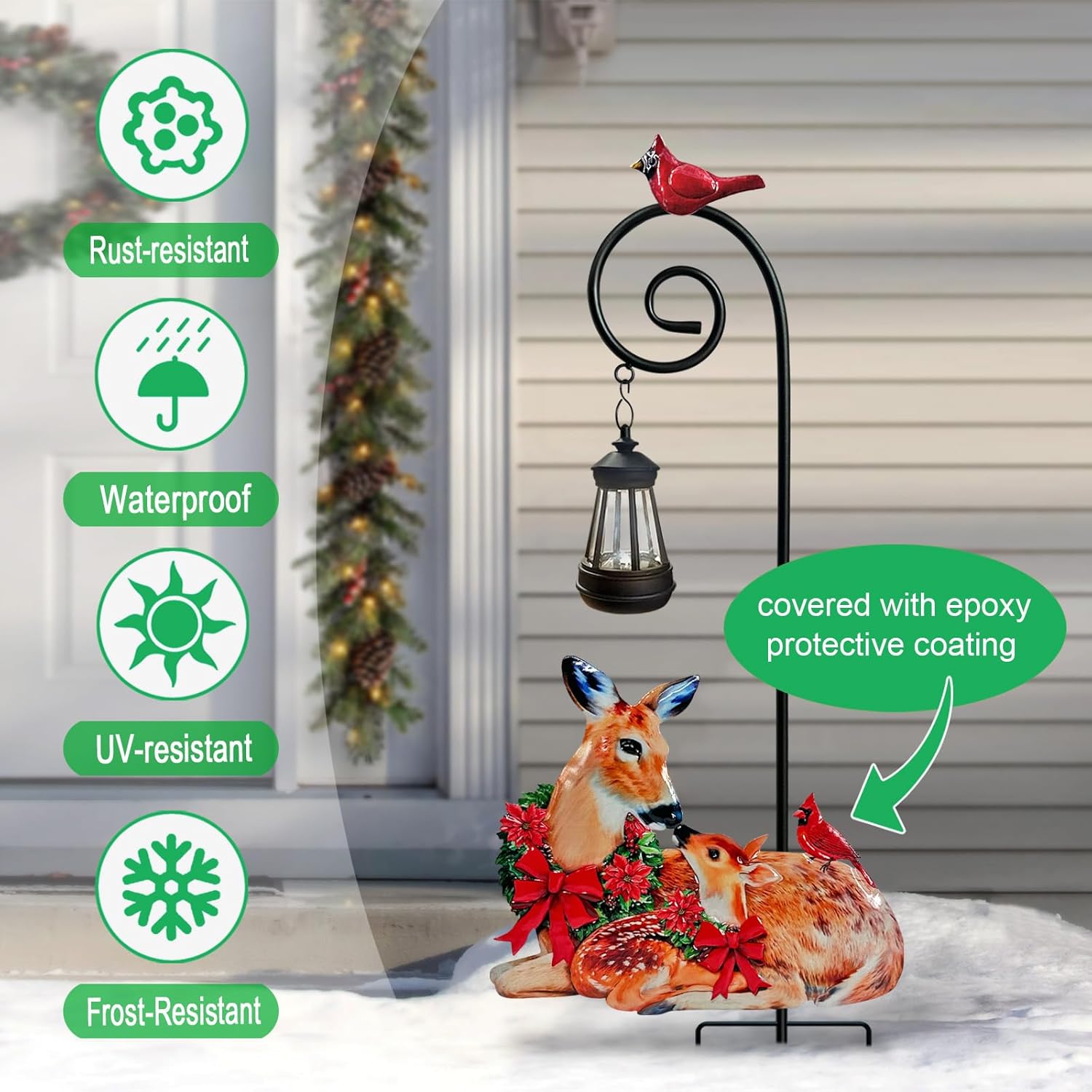• Enhance your outdoor space with our elegant metal deer garden decor, featuring a solar powered lantern for charming illumination. Perfect for patio lights solar powered setups, this waterproof decoration adds a festive touch to garden solar lights displays.